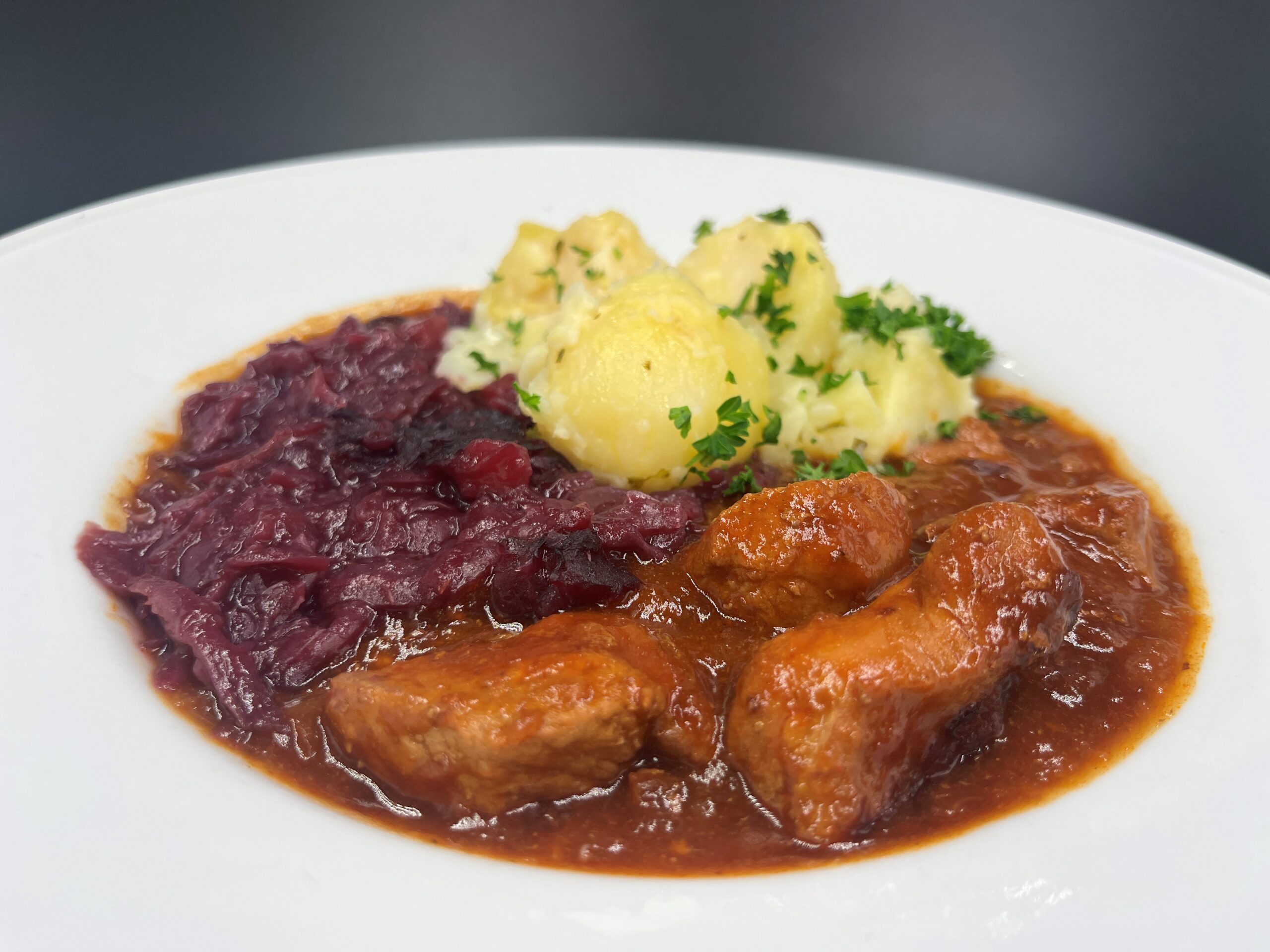 Gulasch vom Schwein u. Rind dazu Rotkohl und Kartoffeln