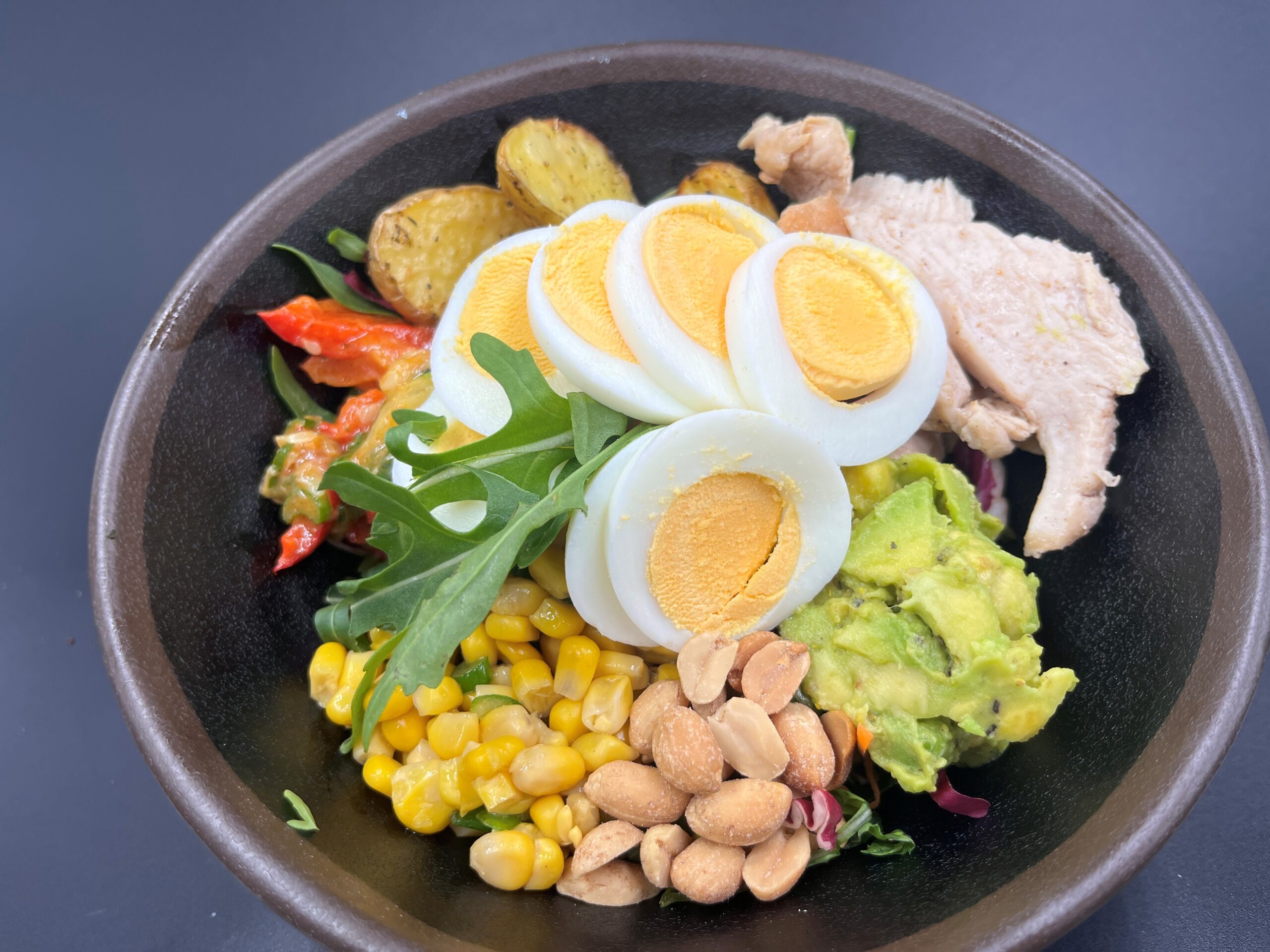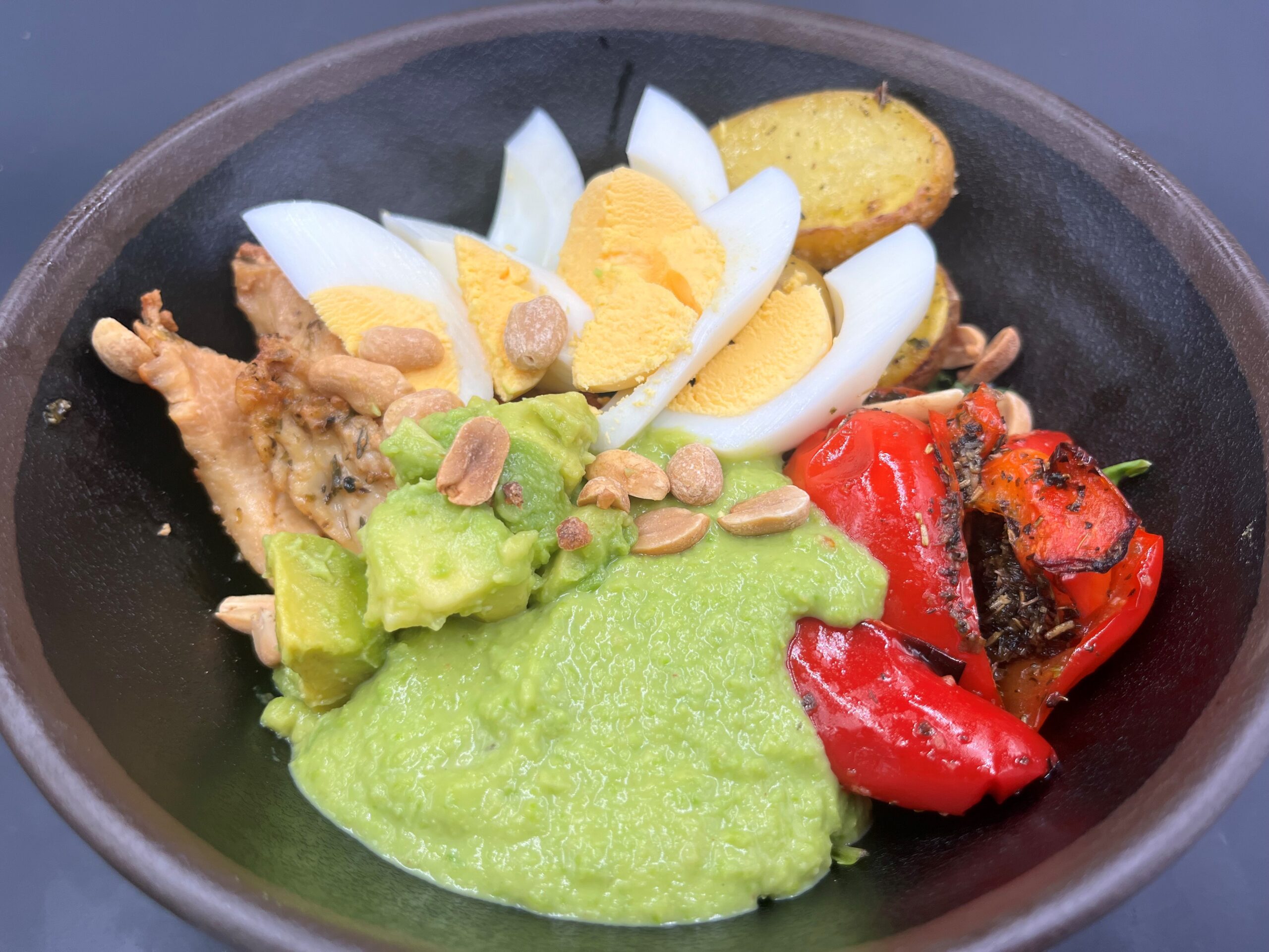 Bowl mit gebackenen Kartoffeln, Hähnchen, Ei, Avocado und Erdnüssen